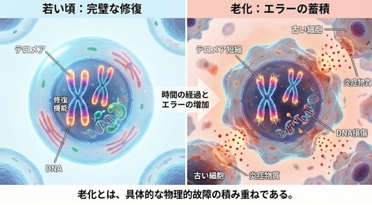 若い頃は体の修復機能が完璧に働き、DNAの傷を治すことができます。しかし、加齢とともに修復システムのエラーが増え、傷ついた細胞が死滅せずに「古い細胞」として居座り、周囲に炎症物質をまき散らすようになります。これが全身の機能を低下させる原因の一つとされています [Cell, 2023 January]。 つまり老化とは、魔法のような時間の経過ではなく、具体的な物理的故障の積み重ねなのです。