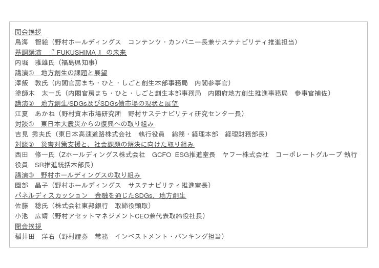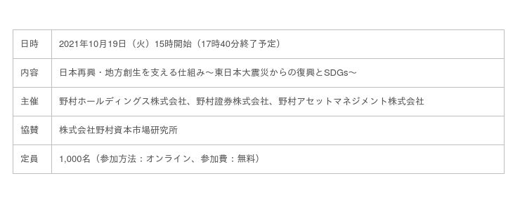 野村アセットマネジメント株式会社(以下「当社」、CEO兼代表取締役社長小池 広靖)は、野村ホールディングス株式会社、野村證券株式会社と共同でオンラインセミナー「日本再興・地方創生を支える仕組み~東日本大震災からの復興とSDGs~」を10月19日に開催します。セミナーの視聴方法は下記要領の通りです。