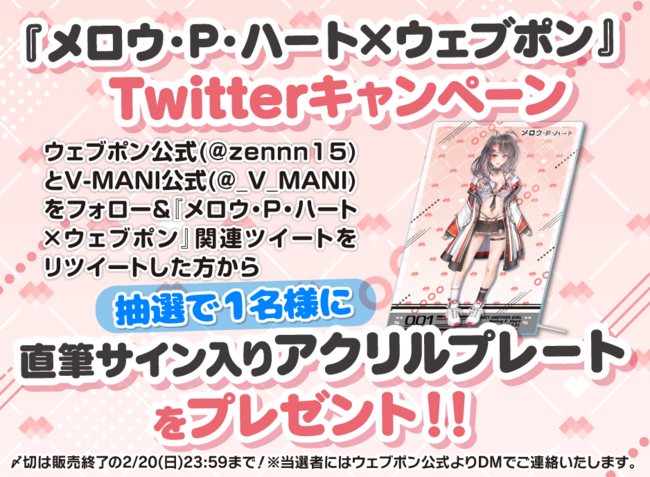 "理想のパートナー"をコンセプトに生まれた美少女VTuber『メロウ・P・ハート』の「直筆サイン入りブロマイド」や「あなたへのメッセージ動画」など、豪華な景品が盛りだくさんです。