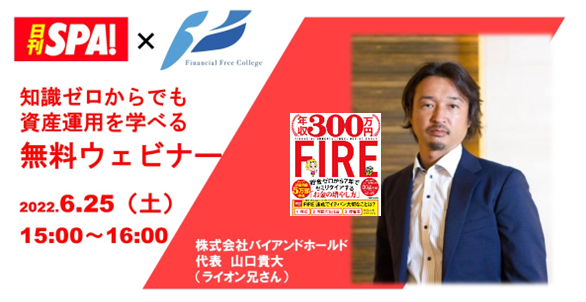 金融・起業のマネースクール「Financial Free College」を運営する株式会社バイアンドホールドと、ビジネスマンのリアルを追いかけるニュースサイト「日刊SPA!」は、知識ゼロからでも資産運用を学べる無料ウェビナーを6月25日(土)にオンラインにて共同開催します。