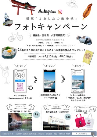 新型コロナウイルス感染症の影響により近隣地域内の観光(マイクロツーリズム)への注目が高まる中、地域の魅力の再発見につながる情報をお届けする公式Instagram「あしたの散歩帖」において、相馬市内で撮影した写真を募集するフォトキャンペーンを実施します。