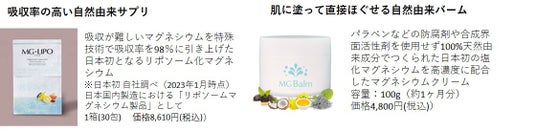 オーガニックサイエンス社は、国内マグネシウム製品の開発・販売においてパイオニアとして活動しており、経皮吸収に優れた「マグバーム」と、リポソーム化技術により体内吸収率を高めた「マグリポ」を、日本代表ラグビーチームをはじめとするアスリートや180以上の医療機関に製品を提供してまいりました。私たちはこれらの実績を基に、これからも老若男女全ての人々のウェルビーイングな毎日を支えるための製品開発、及び普及に努めてまいります。