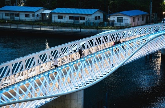 勝どき駅と晴海三丁目を結ぶ歩行者専用橋「黎明小橋(れいめいこばし)」は、2024年3月25日に開通しました。朝潮運河をまたぎ、勝どきエリアの新たな賑わいと憩いの場として広大な緑地と水辺を抱く街「GRAND MARINA TOKYO」へとつながる同橋は、水面に波打つような柔らかな曲線のデザインが、おだやかな波のイメージを表現しています。連続する白い部材を水上に浮かべる構成により、繊細な動きが水面のきらめきと重なり、ウェーブの美しさを際立たせています。さらに、水面に映り込む橋の姿は、重なり合ういくつもの波を思わせます。