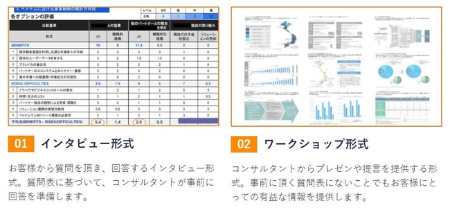 ワークショップ形式はコンサルタントがプレゼンや提言を提供する形式です。こちらも事前に質問票をお送りいただきつつ、お客様にとって有益な情報・提言を質問票に無い項目でも追加提供します。
