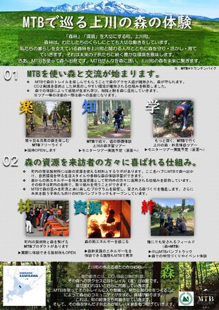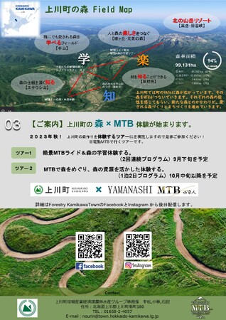 上川町の豊かな森には、新しい冒険と学びが広がっています。整備された山道(トレイル)を通じて、MTBを駆使し、森の魅力を存分に楽しみながら、森林資源の活用方法を学びます。これにより、森林資源を製品や熱エネルギー源として利用し、地域社会をより結びつけ、絆を深める取り組みがスタートしました。