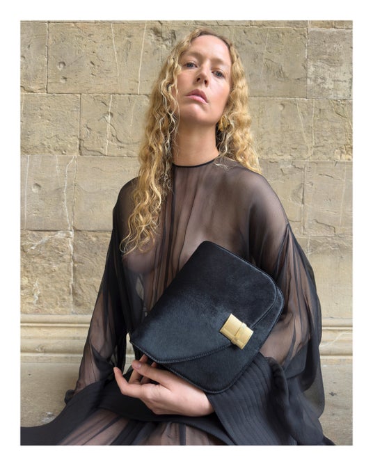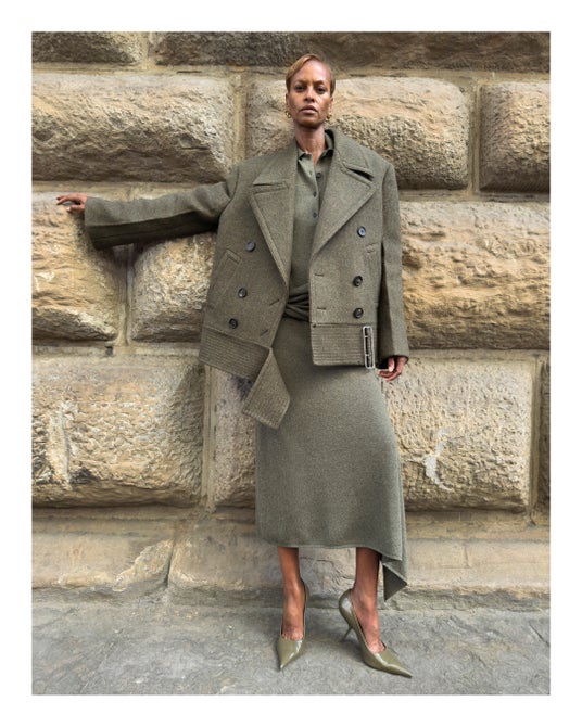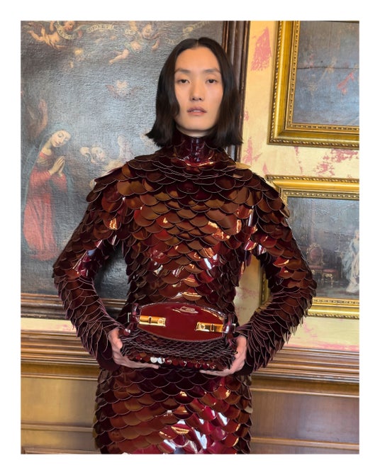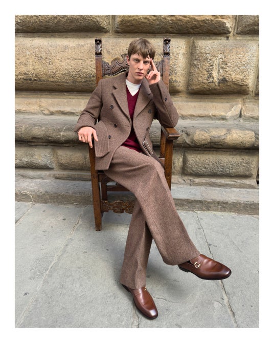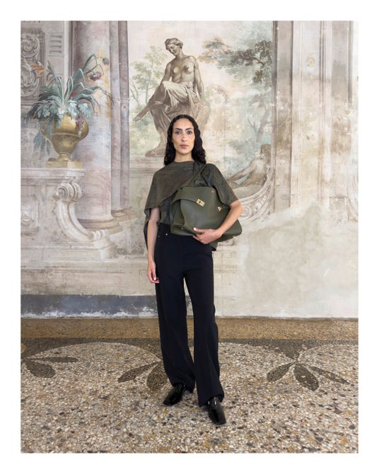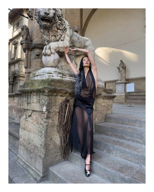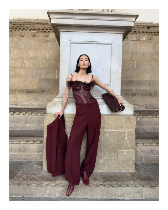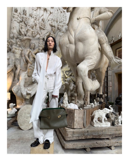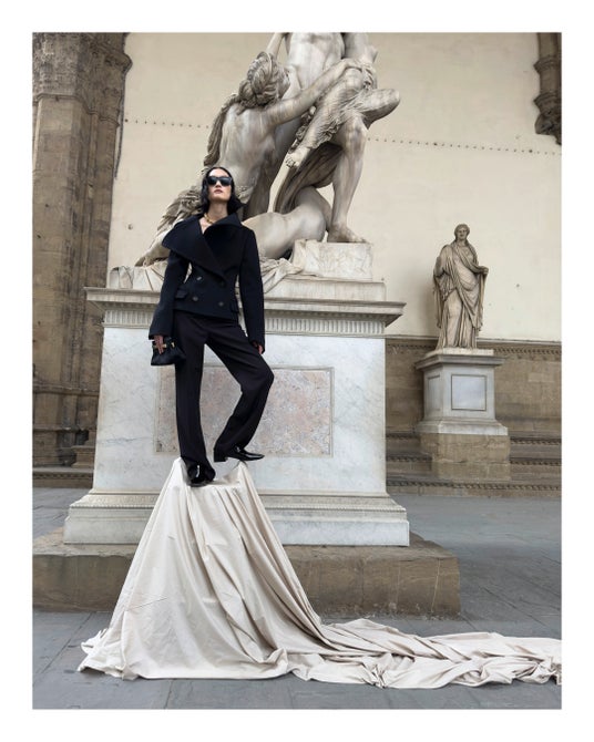 2024秋冬コレクションのランウェイで登場したアイテムは、今日この世界を生きるためのワードローブというスピリットを反映させるために、歴史やアーカイブを分解し再構築したもの。13世紀に建てられ、1930年にフェラガモの本社となったスピニ・フェローニ宮殿から見える街並みや広場、著名なルネッサンス期の彫刻作品が展示されているランツィの回廊、そしてその向かいにあるカフェまで、街中を探索しながらモダニティとヘリテージ、日常と非日常が同時に存在するフィレンツェの街のリアルを表現した。