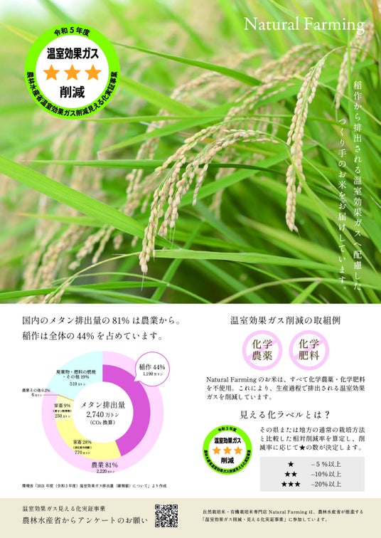Natural Farmingでは、農林水産省の実施する「令和5年度 農林水産省温室効果ガス削減見える化実証事業」に参加し、取り扱いしているお米の温室効果ガス削減レベルを星3つの最高レベルと評価いただきました。