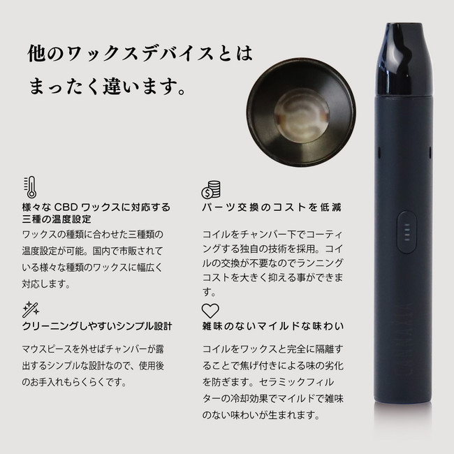 カンナシアのワックス用デバイスは、コイルをチャンバー下でコーティングする独自の技術を採用しています。