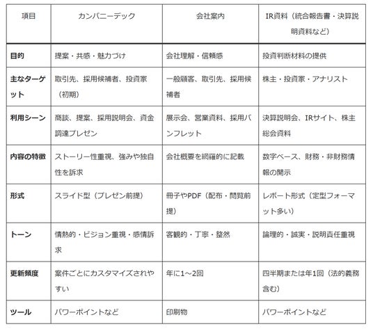 カンパニーデック・会社案内・IR資料の違い