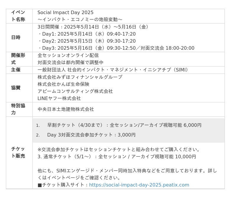 一般財団法人社会的インパクト・マネジメント・イニシアチブ(本社:東京都渋谷区、代表理事:今田克司)は、社会的インパクトについて学び・議論を深めるためのイベント「Social Impact Day 2025 ~インパクト・エコノミーの地殻変動 (以下、「SID2025」)」を2025年5月14日~16日の3日間開催いたいします。3月12日より、特設サイト(https://social-impact-day-2025.simi.or.jp)を開設し、参加申し込みチケットの販売を開始いたします。
