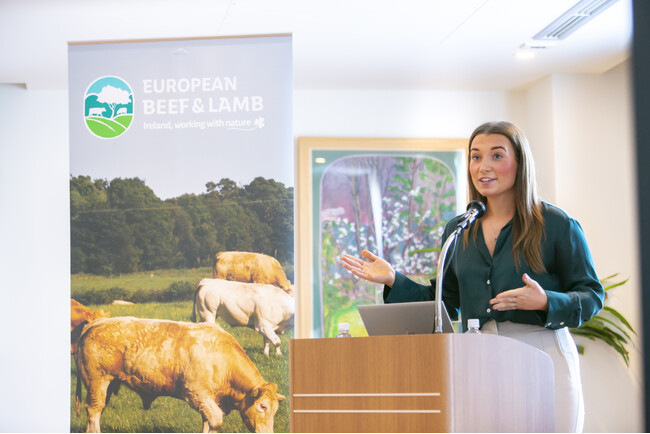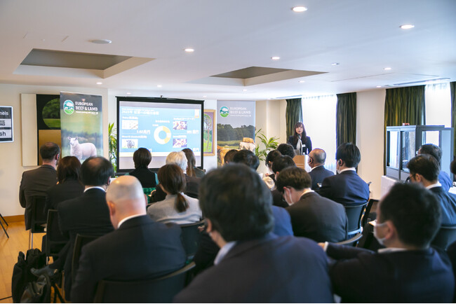 セミナーでは、日本市場スペシャリストのカレン・バリフ氏がボード・ビアの日本での活動報告をアップデート、続いて、この日のために来日した、ボード・ビア食肉セクター代表のショーナ・ジャガー氏が繁殖技術を中心に、最新のヨーロピアン ビーフ&ラム・セクターの展望、アイルランドの酪農家は伝統と最先端技術を融合させ、肉牛繁殖の最適化と効率化を図っていること、アイルランド肉牛生産者連盟(ICBF)は、すべての家畜の遺伝的価値を評価するDairy Beef Indexを提供しており、酪農家は、分娩が容易で、妊娠期間が短く、体型の良い、より良い肉を生産するための選択方法を知ることができることなどを説明しました。そして、調査会社GIRAマーケット・アナリストの西出香氏は、日本の食肉産業が直面している輸入の課題を掘り下げ、将来の需要に関する鍵となる洞察を発表しました。セミナーの後、実施されたネットワーキング・レセプションには、業界関係者34名の参加をいただき、ヨーロピアン ビーフ&ラムのお料理を堪能しました。