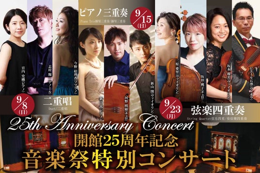 今年開館25周年を迎えるにあたり今まで当館に様々な音色、音楽を届けてくれた演奏家たちによるコンサートを毎週開催。開催日は9月8日(日)二重唱、9月15日(日)ピアノ三重奏、9月23日(月)弦楽四重奏でお送り致します。