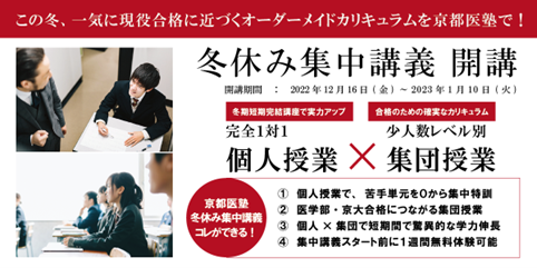 偏差値40からの医学部専門予備校、京都医塾株式会社(本社:京都市中京区 代表取締役 伊藤 章)は、完全1対1の個人授業×少人数レベル別集団のハイブリッド授業で、医学部合格を目指す短期完結講座「冬休み集中講義」を2022年12月16日(金)より開始いたします。