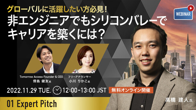 日本とシリコンバレーを繫ぐコンサルティング会社 Tomorrow Access LLC(本社:米国カリフォルニア、Founder & CEO:傍島 健友)は、「非エンジニアでもシリコンバレーでキャリアを築くには?」をテーマにした無料オンラインウェビナー「01 Expert Pitch #17」を開催します。
