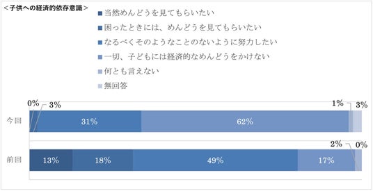 今回の調査では、「一切こどもには経済的な面倒をかけない」が62%と過半数を占め、「なるべくそのようなことの無いように努力したい」が31%、「当然面倒を見てもらいたい」は0%となっており、子供に経済的な負担をかけないようにしたいという答えが大多数となっている。