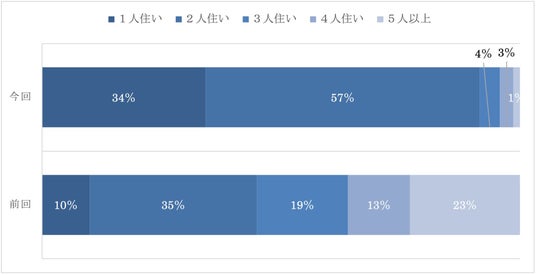 5人以上が23%、4人が13%、3人が19%で、3人以上の同居家族の割合が合わせて5割を超えていた前回調査と比較すると大きく異なっている。