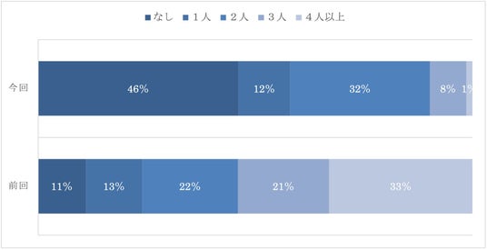 前回調査では、4人以上が最も割合が高く33%、3人も21%を占め、子供3人以上が5割を超えており、今回の調査とは大きく割合が異なっている。