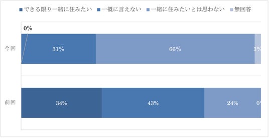 今回の調査では、「一緒に住みたいとは思わない」が66%と全体の3分の2を占める一方、「できる限り一緒に住みたい」は0%となっている。前回調査では「できる限り一緒に住みたい」が34%であったの比較すると大きな変化となっている。