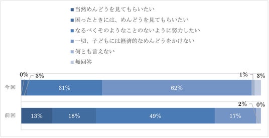 前回調査においては、「一切こどもには経済的な面倒をかけない」は17%と今回よりも割合が低く、「当然面倒をみてもらいたい」は13%、「困ったときには面倒を見てもらいたい」が18%と一定の割合を占めていた。