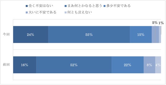 今回の調査では、「まあ何とかなると思う」が55%と最も割合が高く、次いで「全く不安はない」が24%となっていて、両者を合わせると8割近くを占めている。