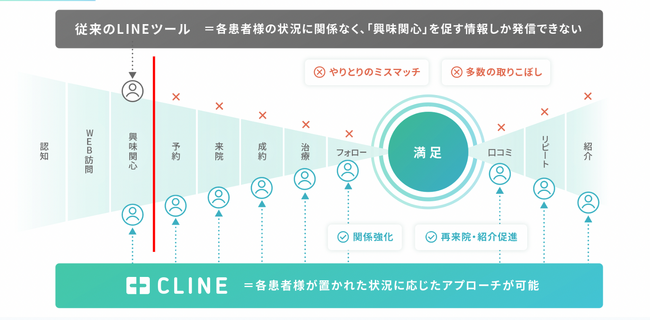 例えば「来院したものの治療に至らなかった」というカルテ上の情報がLINEのアカウントと紐づくことで、個人を特定することができます。これによって、その方に最適化した情報を再度個別に送ることができます。