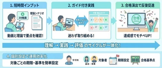 各ロープレには「3分で要点が分かる理論ショート説明動画」と「実施中に参照できる説明画像(ガイド)」を用意し、“いきなり実践”に入るのではなく、理解→お手本→実践→評価→再挑戦 の学習サイクルを回しやすい構成にしています。