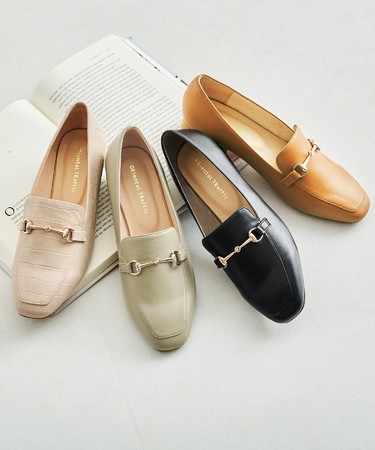 定番のマニッシュなローファーは、今季も外せないマストアイテム。華奢なゴールドのビットモチーフや、中敷を落ち着いた色味のベージュにすることで、高級感のある仕上がりに。