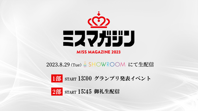 株式会社講談社は、「ミスマガジン2023 グランプリ発表イベント」を8月29日(火)に開催いたします。本イベントでは、募総数3,204 名の中から選ばれたグランプリの他、ミスヤングマガジンやミス週刊少年マガジン、読者特別賞、審査員特別賞の計5部門の受賞者を発表いたします。また本年度は、応援してくださるファンの皆様に「ミスマガジン2023」グランプリが発表される瞬間をリアルタイムでお届けしたいという想いから、ライブ配信サービスSHOWROOMの「SHOWROOMプレミアムライブ」にて生配信が決定。2023年8月23日(水)20時より本配信のチケットを販売開始します。
