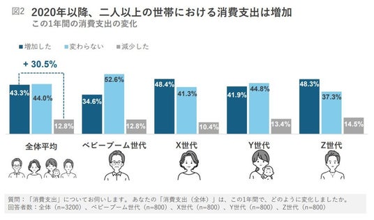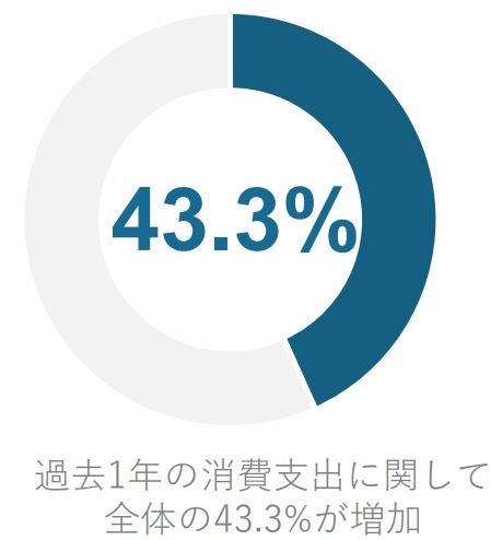 当社の調査結果においても、過去1年間の消費支出に関して、全体の43.3%が増加したと回答しており、減少したとする層の12.8%を30ポイント以上も上回っている(図2)。消費支出が増加傾向にあることは明白である。