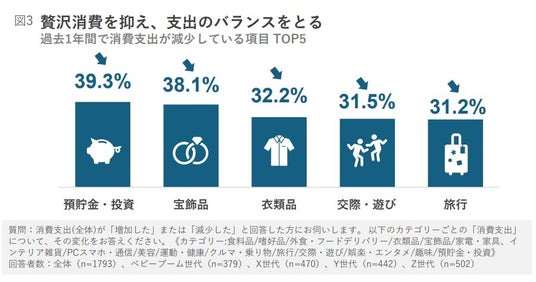 ひとつは、特定カテゴリーにおける支出を下げることである。過去1年間で消費支出が減少している項目は、預貯金・投資、宝飾品、衣類品、交際・遊び、旅行の順で高くなっている(図3)。食料品のような生活必需品ではない、いわゆる贅沢消費の対象となる項目で消費を抑えている。