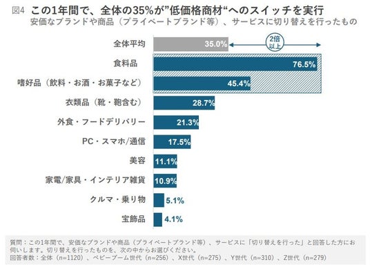 もうひとつは、安価なブランドや商品、サービスへの切り替えである。この1年間で、全体の35.0%が低価格商材へのスイッチを実行している。特にその傾向が強いのが、消費支出の増加の主要因となっている、食料品と嗜好品であり、他のカテゴリーを大きく上回っている(図4)。