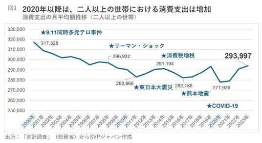 近年、日本の消費支出額は増加傾向にある。総務省の「家計調査」(図1)においては、コロナ禍からの経済活動の回復から、2020年以降は、二人以上の世帯における消費支出は増加している。