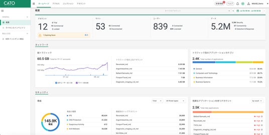 チャネルパートナーは、一元管理を可能にするCatoの新しいマルチテナント型ダッシュボードを通じて、計画からデプロイメント、本番まで顧客のライフライクル全体を管理することができます。ライセンスの利用状況や期限、セキュリティリスクの度合い、ネットワークの問題など、顧客アカウントの詳細な状況が一目で確認でき、迅速な対応が可能です。