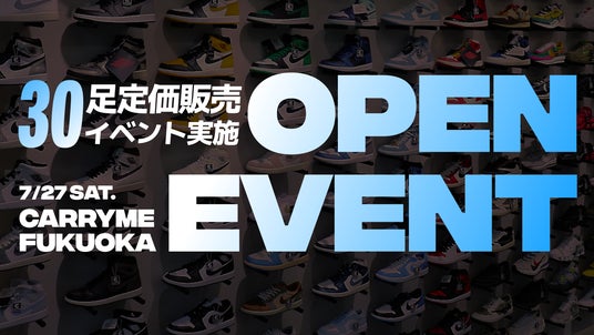 九州エリア初の実店舗となる『CARRYME Fukuoka』(キャリーミー福岡)のオープンを記念して、 人気スニーカー30足の定価販売イベントを開催いたします