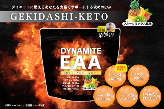 理想的な減量に燃える人を力強くサポートすることをコンセプトに開発されたアミノ酸サプリメント「激出EAA withBHB」が「DYNAMITE EAA(ダイナマイト・イーエーエー)」として新たなフレーバー・配合のラインナップを加えてリニューアルすることとなりました。