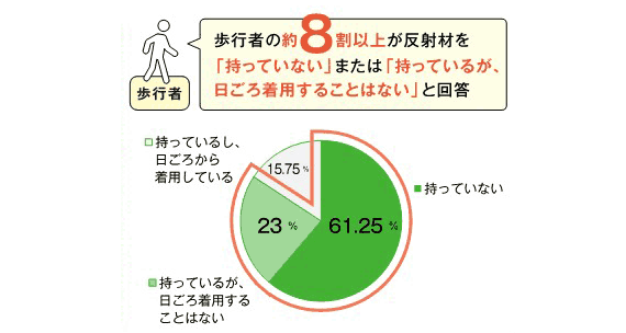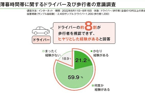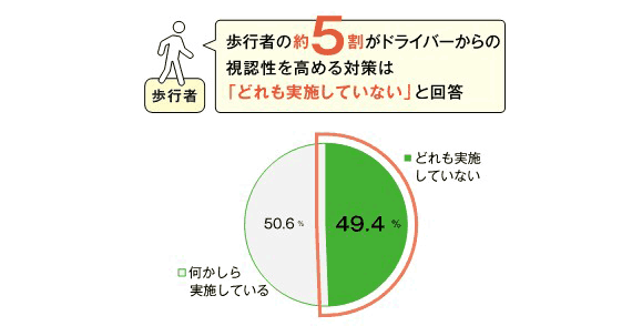また、薄暮時間帯に関するドライバー・歩行者の意識調査によると、ドライバーから歩行者を視認できることが事故防止に大変重要にもかかわらず、実際に対策をしている歩行者の割合は少ないという実態があります。