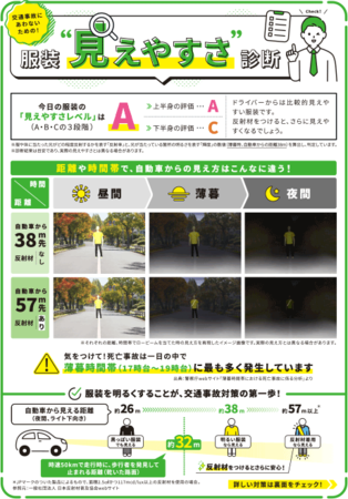 本ソフトウェアは、自身の姿がどのようにドライバーから見えるのかが簡単にわかり、少しでも明るい服装を心がけ、また、反射材を着用するなどの行動につなげるきっかけとなることを目指しています。