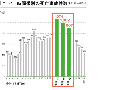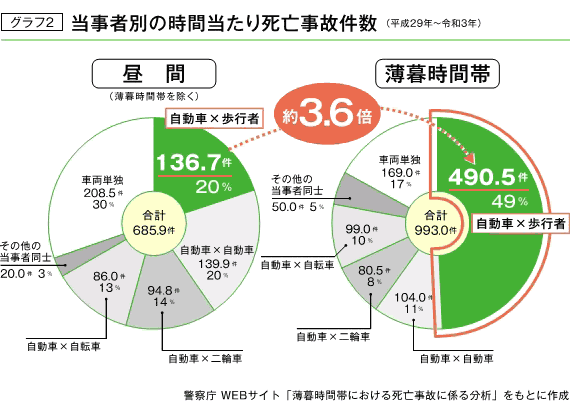 交通死亡事故は、一日の中で17時台~19時台において最も多く発生(グラフ1)しており、薄暮時間帯の「自動車対歩行者」事故の時間当たりの死亡事故件数は、昼間と比べて約3.6倍発生(グラフ2)しています。