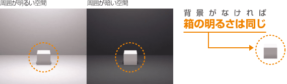 壁の色が異なる空間に、同じ色の箱を入れて見比べると、箱の明るさが違って見えます。