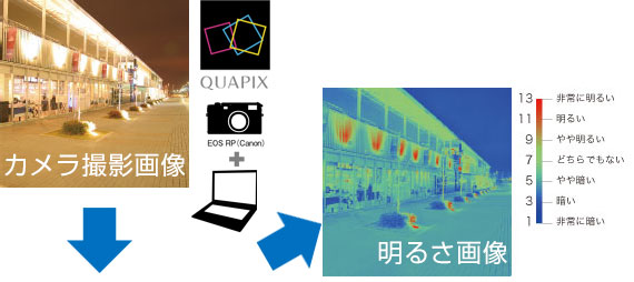 人が感じる明るさを13段階のスケールで評価し、「明るさ画像」としてビジュアル化。
