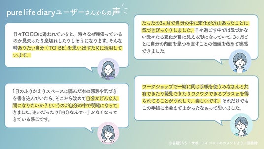 「意外と今日もいいことがあったな」「自分にやさしくなれてきた気がする」「やりたいことが浮かぶようになってきた」…pure life diaryで、「自分にやさしい変化」をぜひ体感してください。