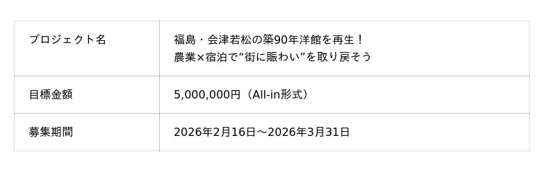 現在はその取り組みをさらに発展させ、福島県会津若松市に所在する歴史的な病院を改修し、宿泊施設として再生する「GIRO宿プロジェクト」を進めており、その資金調達手段としてクラウドファンディングを活用した地域参加型プロジェクトに取り組んでいます。