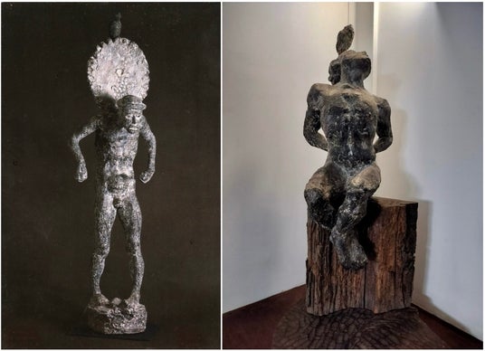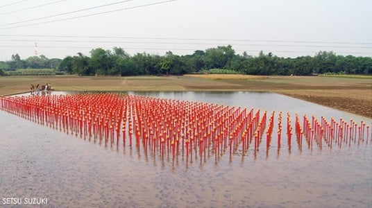 その作品は、ロダンを彷彿とさせる初期のリアリスティックな彫像から、人間を超えた姿を表現するゴシック調の作品に進み、さらに先住民族のアニミズムを思わせる作品、そしてバングラデシュ、インド、ネパールなどの水田で「ラカン」の顔をつけた無数の赤い柱を展開する「田植(TAUE)プロジェクト」(下写真)に行きつきます。