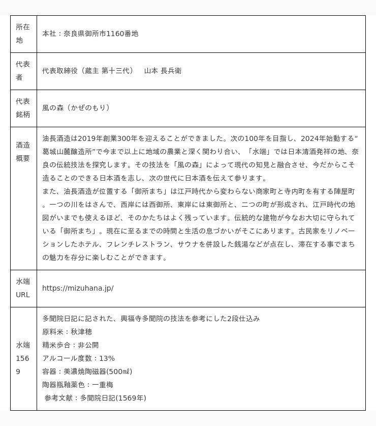 世界中のSAKE LOVER から愛される存在、EUREKA! 千葉 麻里絵 氏の日本酒の歴史、奈良酒への興味、当時の酒への募る思い、それを感じた「風の森」醸造元・油長酒造株式会社(奈良県御所市、蔵主 第十三代:山本 長兵衛、以下「油長酒造」)が、「多聞院日記」の1569年記述を参考に共同で醸造した「水端1569」が本日より販売開始となりました。