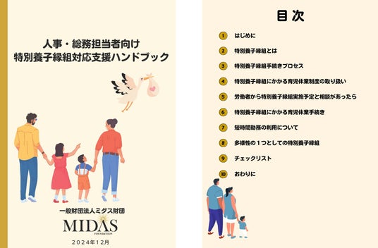 一般財団法人ミダス財団(所在地:東京都港区、代表:吉村英毅、以下「ミダス財団」)は、特別養子縁組支援の一環として、労働者が特別養子縁組を事由に育児休業を取得する際、勤務先が実施すべき対応について、網羅的にまとめたハンドブックを作成・公開しました。