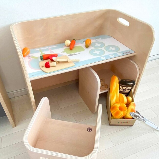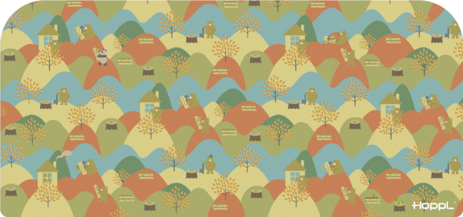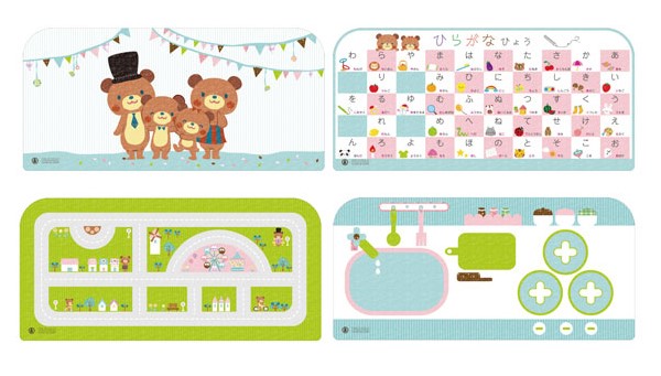 従来のデスクマットは4パターンで使える下敷き(ホップルベアファミリー、ひらがなひょう、ホップルタウンマップ、キッチンセット)が付属していますが、限定デザインでは2パターンの森のくまさんの絵柄を両面でお楽しみいただけます。