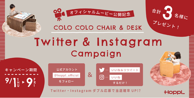 オフィシャルムービー公開と限定デザインデスクマット完成を記念したSNS(Instagram・Twitter)プレゼントキャンペーンが絶賛開催中です。ムービーでも使用している「コロコロチェア&デスク」を、応募者の中から各色1名(合計3名様)へプレゼントします。応募方法はInstagramの場合は公式アカウントのフォローと「いいね!」、Twitterの場合は公式アカウントのフォロー&「いいね!」、さらにリツイートをするだけで、誰でも簡単にご応募いただけます。InstagramとTwitterの両方に応募いただくことで当選確率が2倍になります。