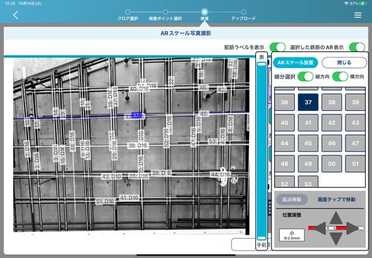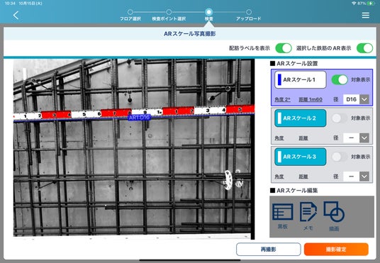 『CONSAIT Eye』(AIカメラ)のピッチ計測精度は、国土交通省の「デジタルデータを活用した鉄筋出来形計測の実施要領(案)」(令和5年7月)(※2)に準拠したレベルです。今回の「ARスケール」機能は、このAIカメラ計測と同じ技術で検知した鉄筋線分に沿って「ARスケール」を配置します。なお、「ARスケール」を表示する際、正対して鉄筋を撮影できているかをアプリが自動判定します。