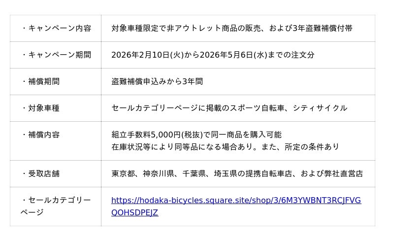 ホダカ株式会社(本社:埼玉県越谷市、代表取締役社長:堀田宗男)は、オンラインショップ「メーカー直販B級品アウトレットショップ」において2026年2月10日(火)から2026年5月6日(水)まで、新生活応援・新車セールを開催いたします。