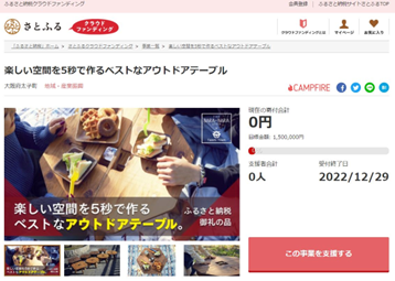 大阪府太子町とふるさと納税ポータルサイト「さとふる」(https://www.satofull.jp/)を運営する株式会社さとふる(本社:東京都中央区、代表取締役社長:藤井 宏明)は、寄付金の使途に応じて事業を立ち上げ寄付を募る「さとふるクラウドファンディング」(https://www.satofull.jp/projects/top.php)にて、新たな地場産品を開発する企業や個人を支援するため、2022年12月16日(金)より寄付受け付けを開始します。その第1号として、町内に本社を置く株式会社アドワンのアウトドアテーブル製作を支援します。